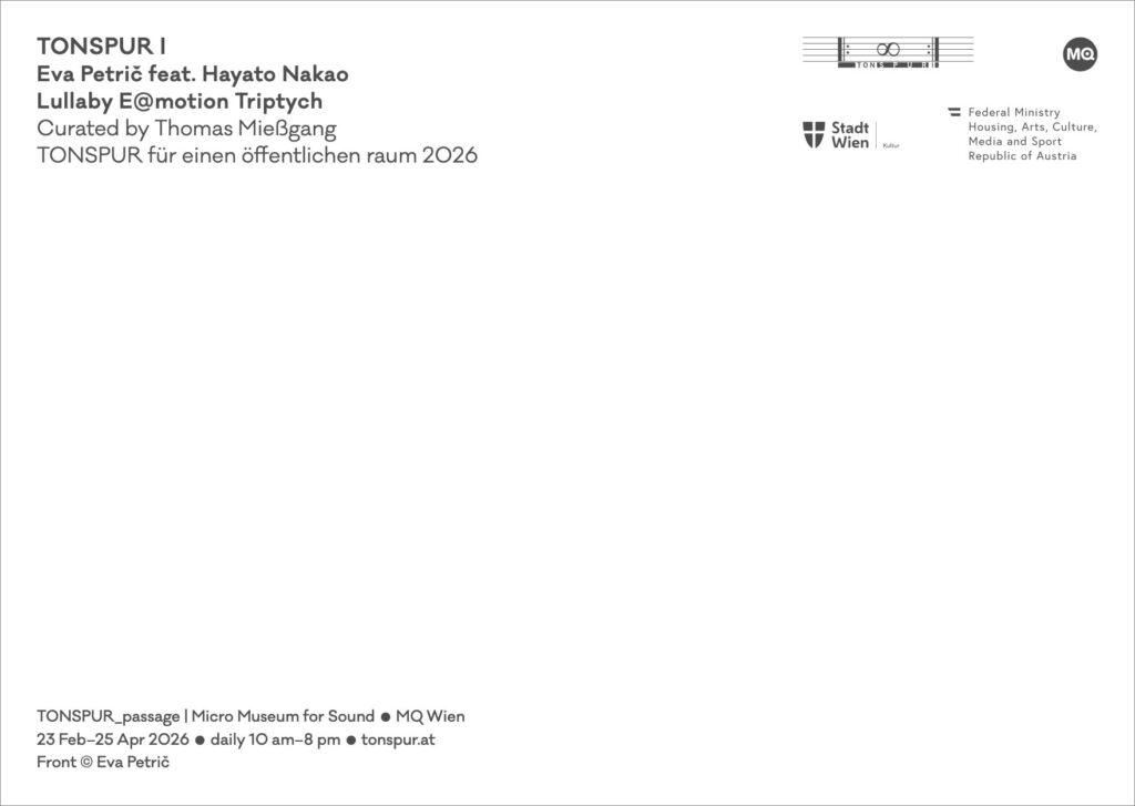 Lullaby E@motion Triptych verwebt wissenschaftliche Fakten, die menschliche Stimme und elektronische Klänge zu einem Raumpoem über die Zerbrechlichkeit des Jetzt, den Rhythmus des Atmens mit der Erde und die Hoffnung, Wiegenlieder möge es so lange geben wie unsere Gefühle.Drei Klangschichten überlagern sich zu einem Triptychon, dessen Kombinationen sich nie wiederholen. Im Gegensatz dazu bildet der Gesang eine lineare Erzählung mit Anfang und Ende. Das in der TONSPUR_passage in Wien präsentierte Werk verwandelt den Durchgang im MQ in einen Inkubator für Emotionen.