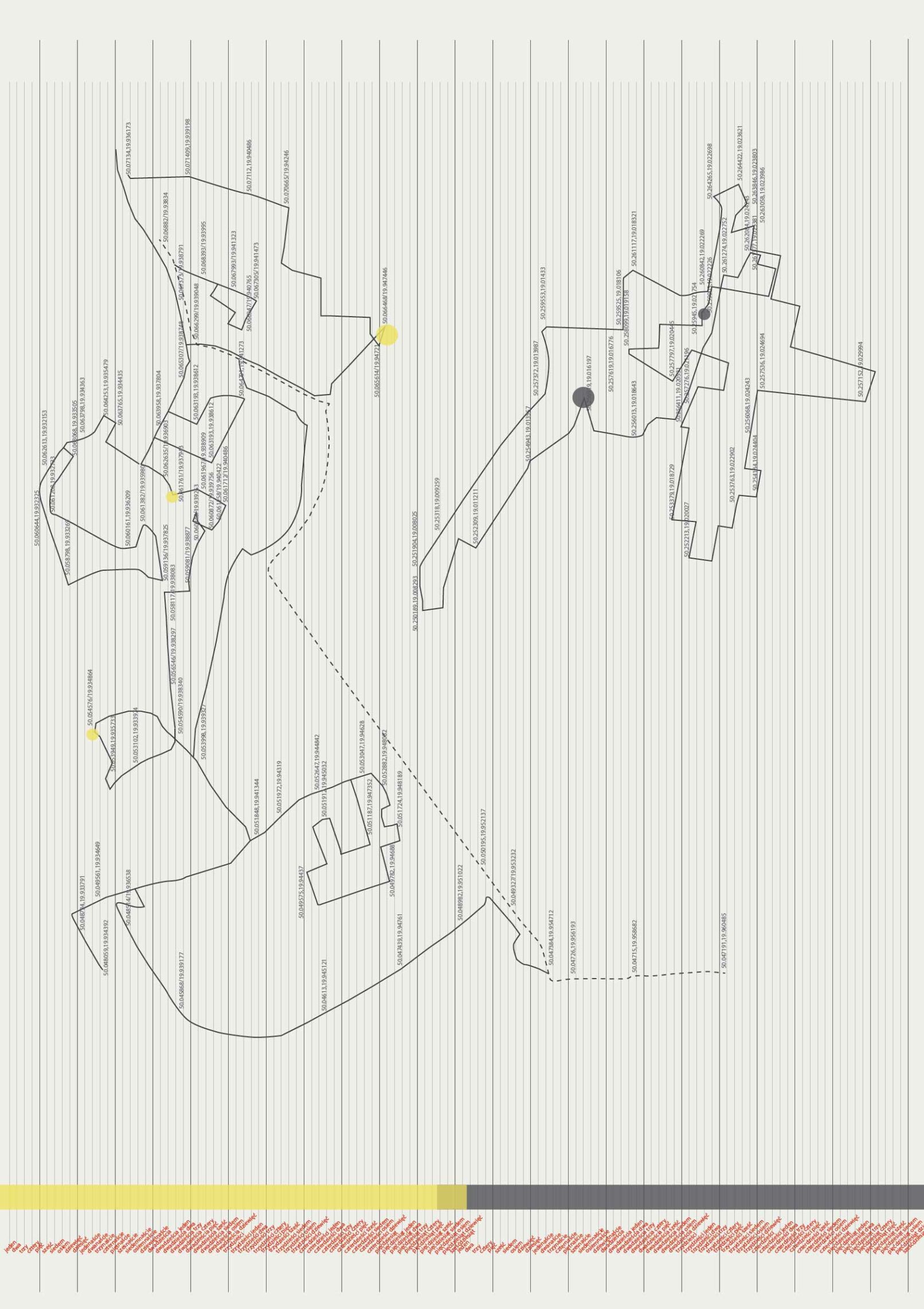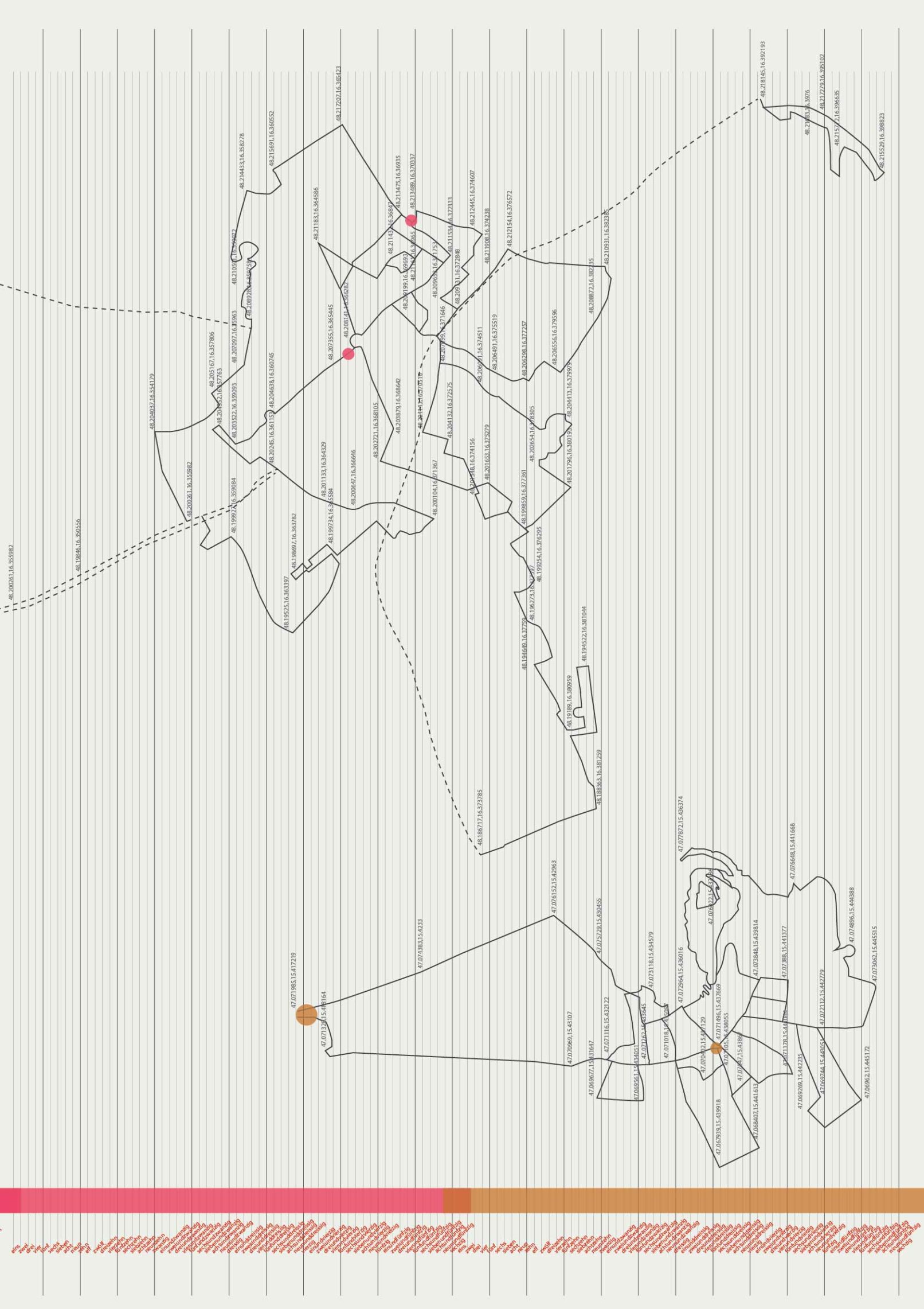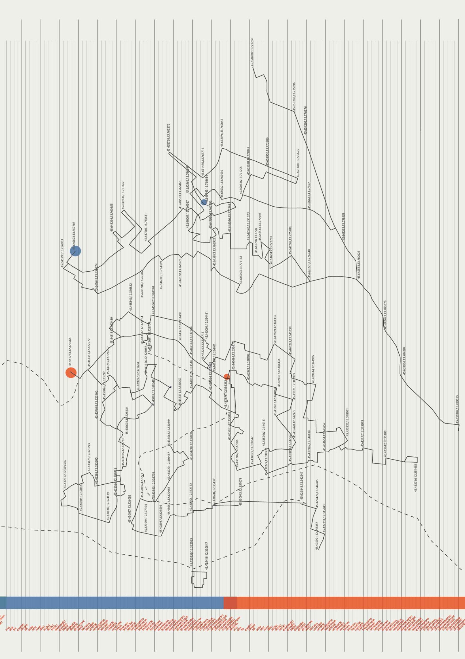 Mit „Kraków to Venice in 12 hours“ zeichnet Magda Stawarska eine Reise nach, die von Polen über die Tschechische Republik, die Slowakei, Österreich und Slowenien nach Italien führte. Stationen waren Krakau, Katowice, Bielsko-Biala, Ostrava, Brno, Bratislava, Wien, Graz, Maribor, Ljubljana, Triest und Venedig. Das Projekt fängt die einzigartigen klanglichen Charaktere dieser zwölf Städte ein und sucht dabei nach ihren Ähnlichkeiten und Unterschieden. Zugleich ist es ein persönlicher und subjektiver Audioreiseführer und ein Tagebuch von Feldaufnahmen, das die verschiedenen Orte über einen Zeitraum hinweg abbildet. Die Künstlerin porträtierte die Städte mit Stereomikrophonen. Zwei davon trug sie auf ihren Wegen in den Ohren, was ihr ermöglichte, das urbane Klangbild aus einer subjektiven Zeitperspektive nachzuzeichnen. Die Unauffälligkeit der Mikrophone gestattete auch die Aufnahme von authentischen Gesprächen, die hernach mit dem einmaligen Klangporträt der Stadt verwoben wurden. Die auf Straßen, Bahnhöfen, Plätzen und in Cafés aufgezeichnete Sprache ist ein zentrales Element der Arbeit, da sie den Übergang von einem Land ins nächste markiert. Im grenzfreien Schengenraum ist sie der einzige räumliche und zeitliche Orientierungspunkt. Das Zifferblatt einer Uhr dient der immersiven Mehrkanal-Klanginstallation als Kompass, wobei die zwölfstündige Komposition synchron zu der echten Reisezeit läuft. Die Plakate „50.06465,19.94498 to 45.441058,12.320845“ zeigen eine Landkarte, auf der die Aufnahmeorte von „Kraków to Venice in 12 hours“ verzeichnet sind. Als Fremde orientierte sich Stawarska-Beaven jeweils an den markanten Plätzen im Stadtraum, doch drängte ihr die jeweilige Stadt auch ihre Struktur auf. So weisen die Kartographien der Wege in jeder Stadt ein charakteristisches Muster auf. Geographische Breiten- und Längenangaben ermöglichen dem Publikum zusätzlich, die exakten Orte der Feldaufnahmen nachzuvollziehen. Das Projekt gibt es auch online als interaktive Plattform, auf der man sich durch den geographischen Raum bewegen und Beispiele der Feldaufnahmen und Kompositionen nachhören kann.