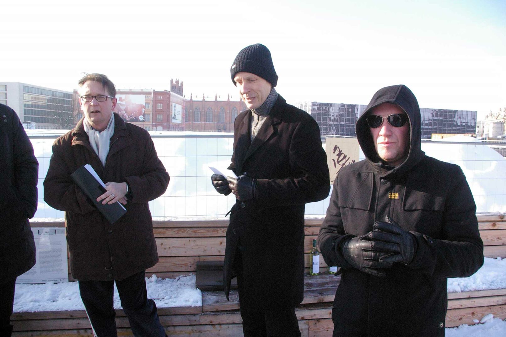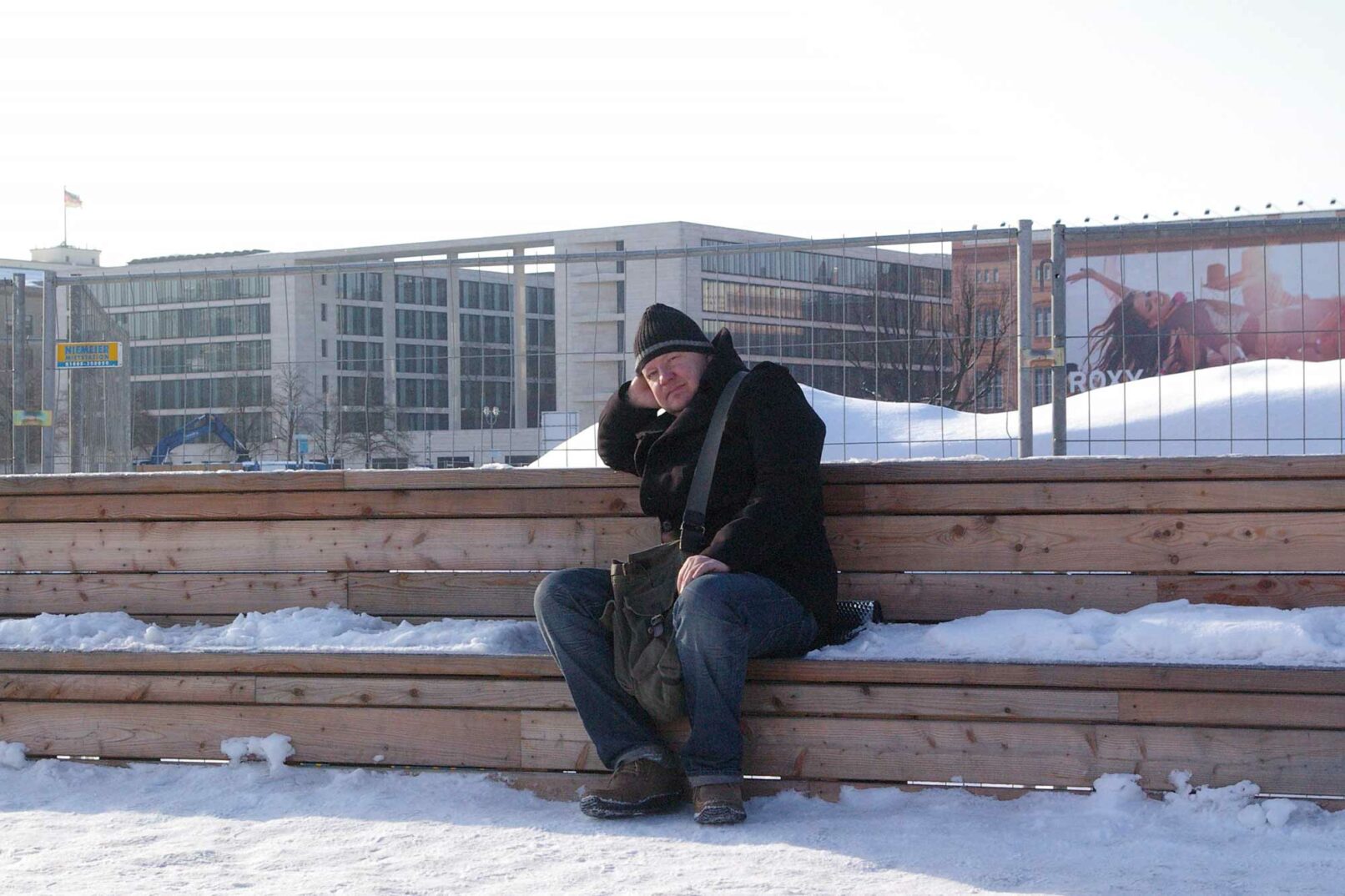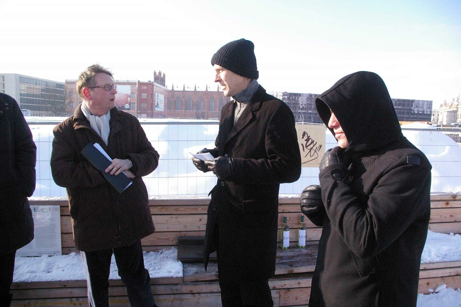 8 audio positions are arranged according to eight stages of life, in order: roughly 10, 20, 30… rising to about 80 years old. The sounds consists of a canon of rising scales on and above the auditory threshold, i.e. into the ultrasonic field, and one of scales descending into the infrasonic field, i.e. sinking to the depths of sound where the tone dissolves into individual sound waves. We can’t hear the latter, we can only feel them: even this part of the music remains inaudible to us — despite the winter weather — until we sit on the bench above one of the speaker positions. The sensory organ for the music heard will no longer be our ears, it’ll be our buttocks.
